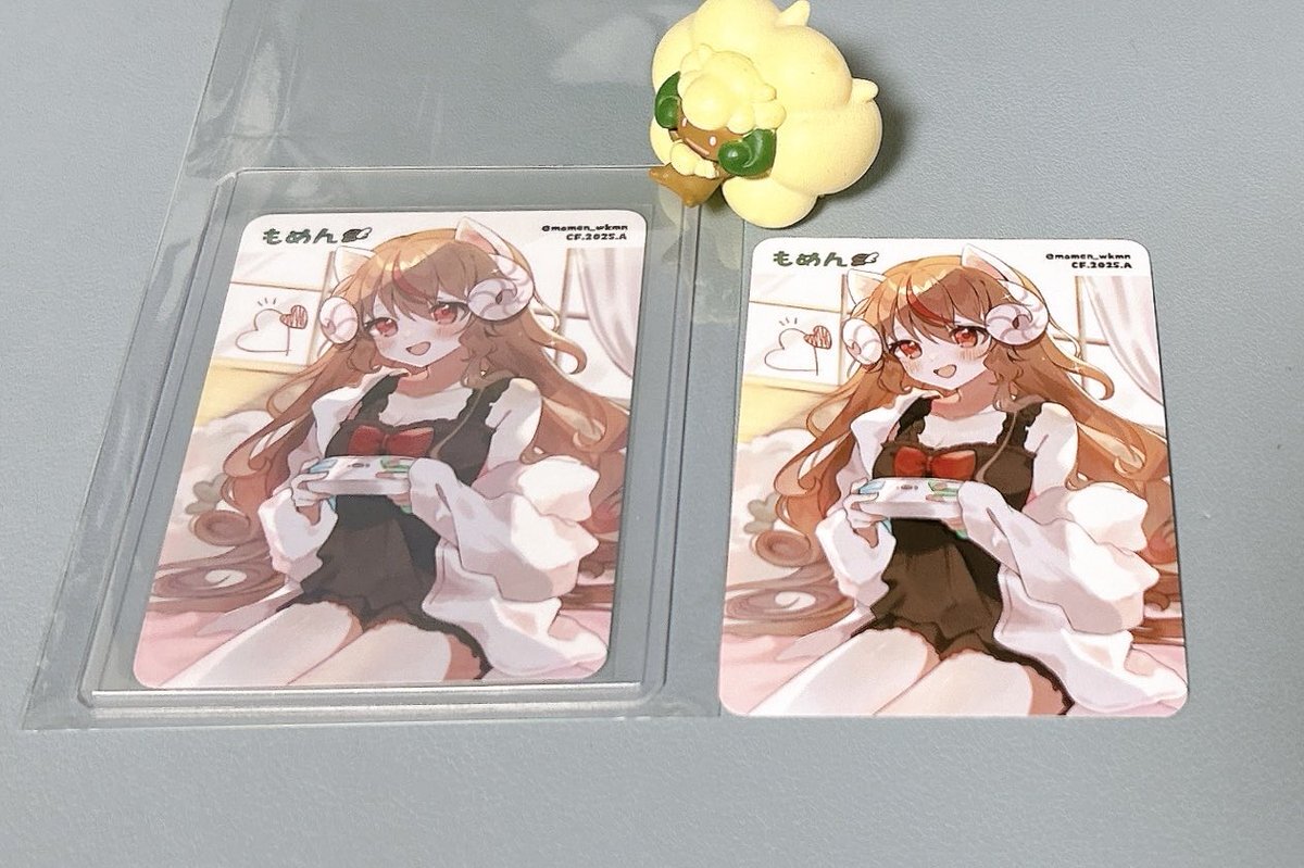 🐏アクスタ(イメージ画像 ※合成) 🐏ラバスト(試作品) 🐏カード(実物) です(Ꮚ ᴖ ̫ ᴖ Ꮚ) アクスタも入稿データ通っているので大丈夫のはず…🥹! カードはサイン失敗考慮で多めに発注したものが届きました🌱 配信で教えてもらったトップローダーも仕入れたので、折れないようにお届けしたい🐏 pic.x.com/4ijNuf7tQT x.com/momen_wkmn/sta…