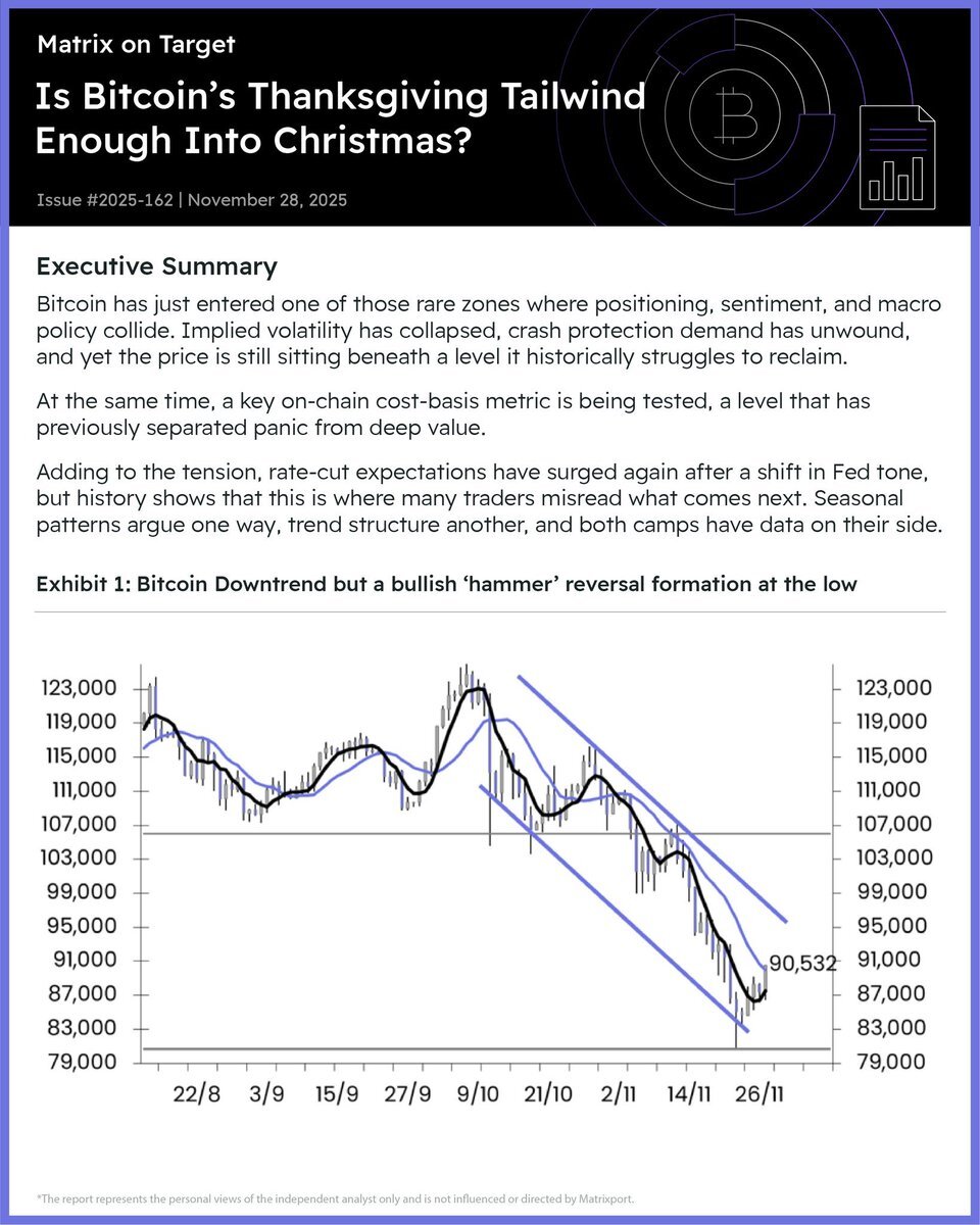 $BTC の下降トレンド、反転せず重要コストゾーンが試される(Matrixport)📊 - インプライドボラティリティは大幅低下、下落ヘッジ需要は減少📉 - 価格は歴史的に突破失敗した重要価格帯を下回る⚠️ - オンチェーンデータで「パニック」と「割安」を区別するコスト指標が試される局面🔍 - x.com/14166806661843…