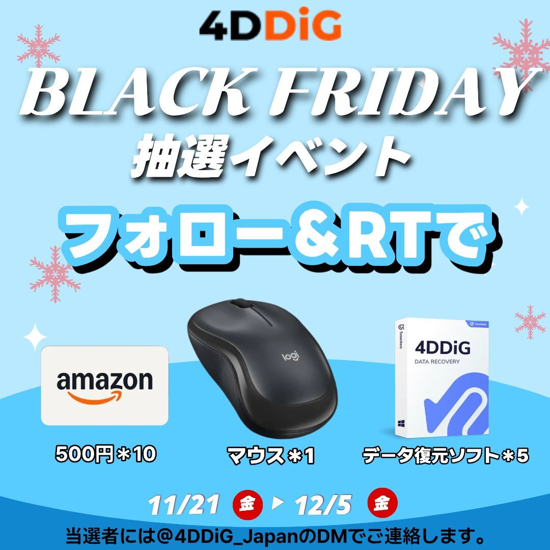 🚨【本日最終日!BLACK FRIDAY 抽選キャンペーン】 総額約4万円相当の豪華プレゼントが当たるチャンス🎁 ロジクールマウスやAmazonギフトカード、4DDiGデータ復元ソフトなど、合計16名様に当たります! ⏳締切は今日12月5日まで!お急ぎください! セールも最大70%OFF開催中👉 x.com/4DDiG_Japan/st…